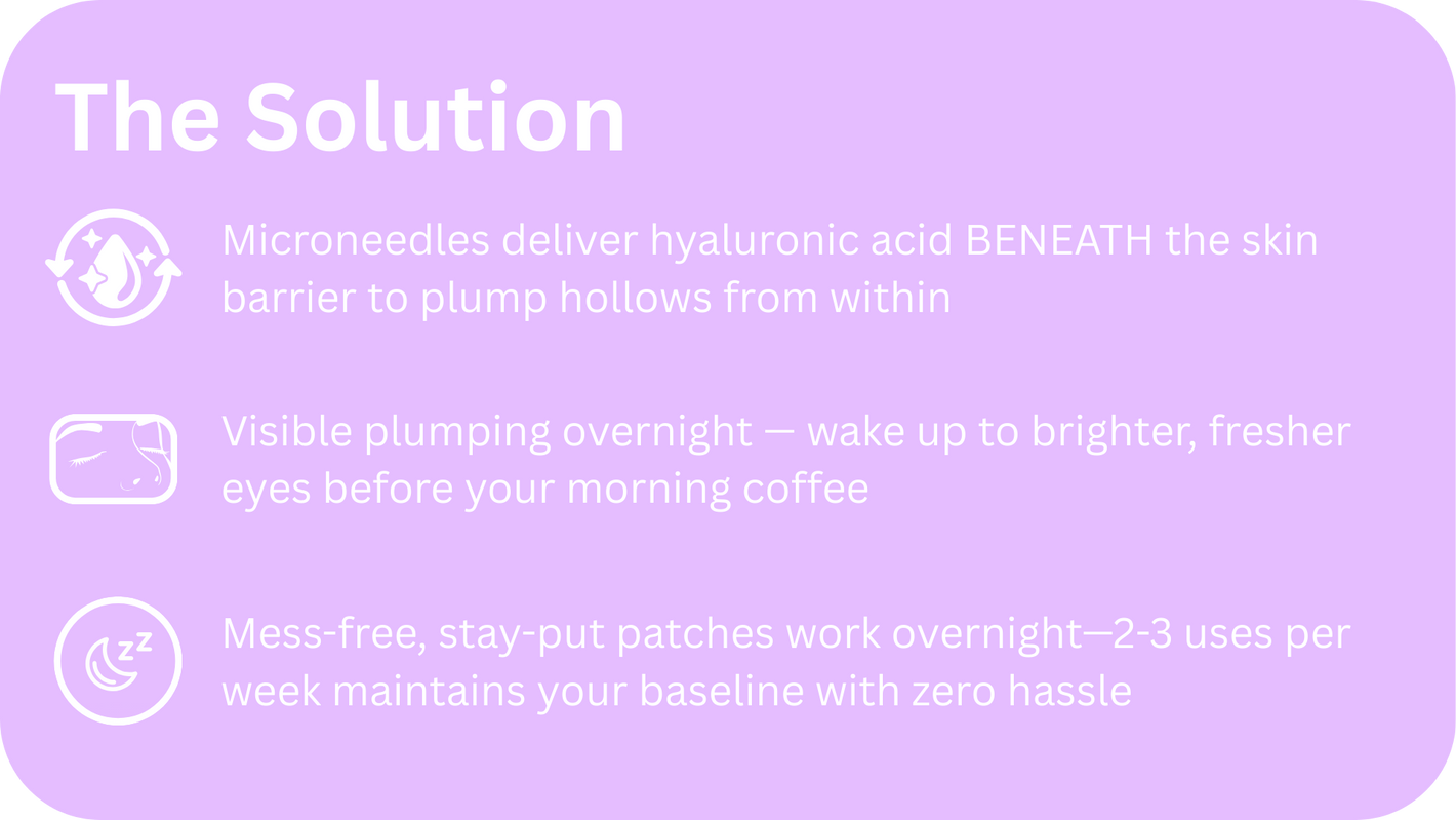 Each patch contains 2,000+ crystallized serum microneedles made of hyaluronic acid and peptides. When you apply the patch, these tiny needles penetrate your skin's protective barrier (which blocks molecules larger than 500 Daltons—including most eye creams).