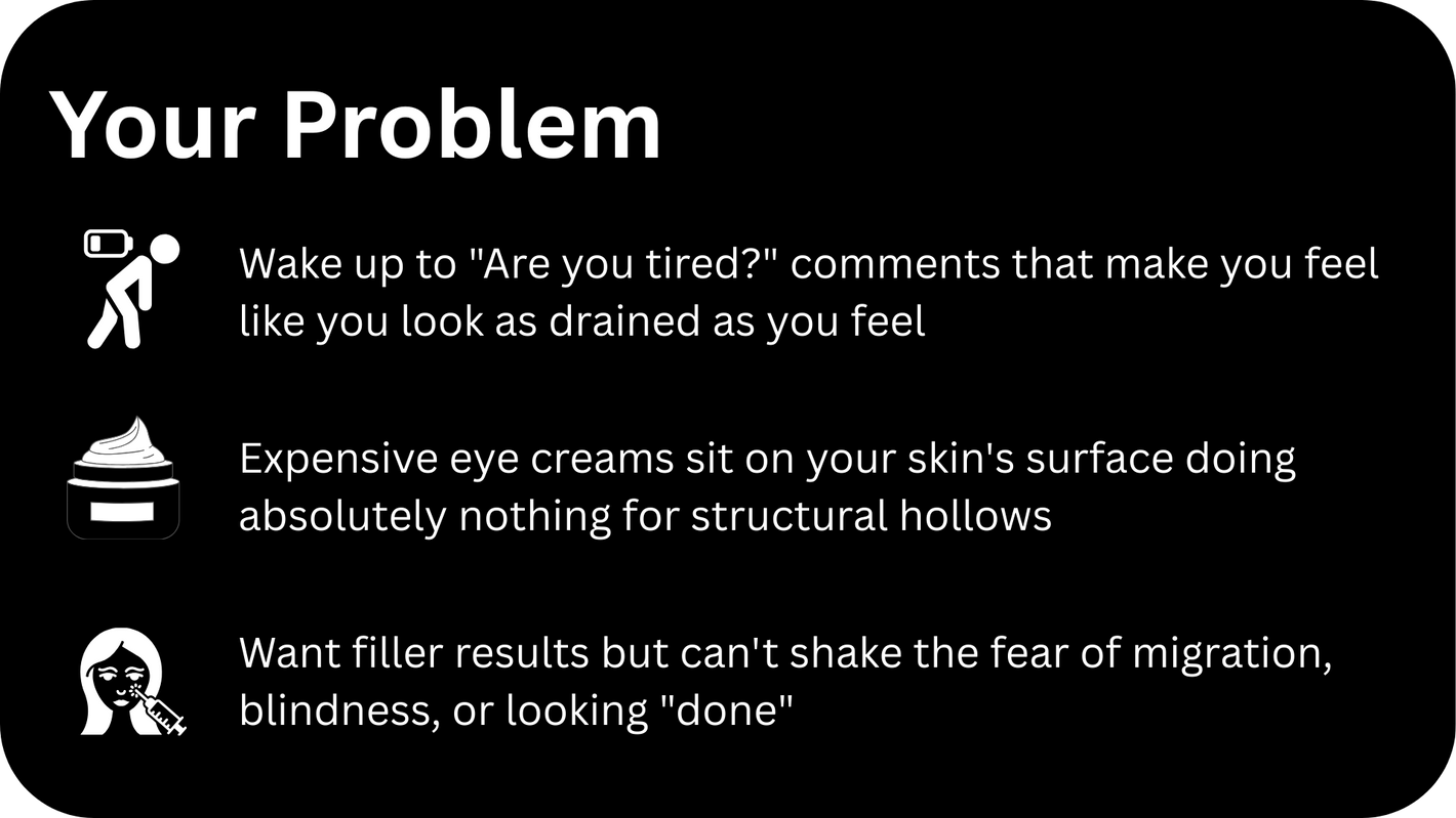 Skin is designed to block molecules larger than 500 Daltons. Standard hyaluronic acid is 300,000+ Daltons. Even the most expensive creams sit on your skin's surface until they evaporate or get washed off. They can hydrate the top layer, but they can't reach the dermis where hollows and structural wrinkles form.